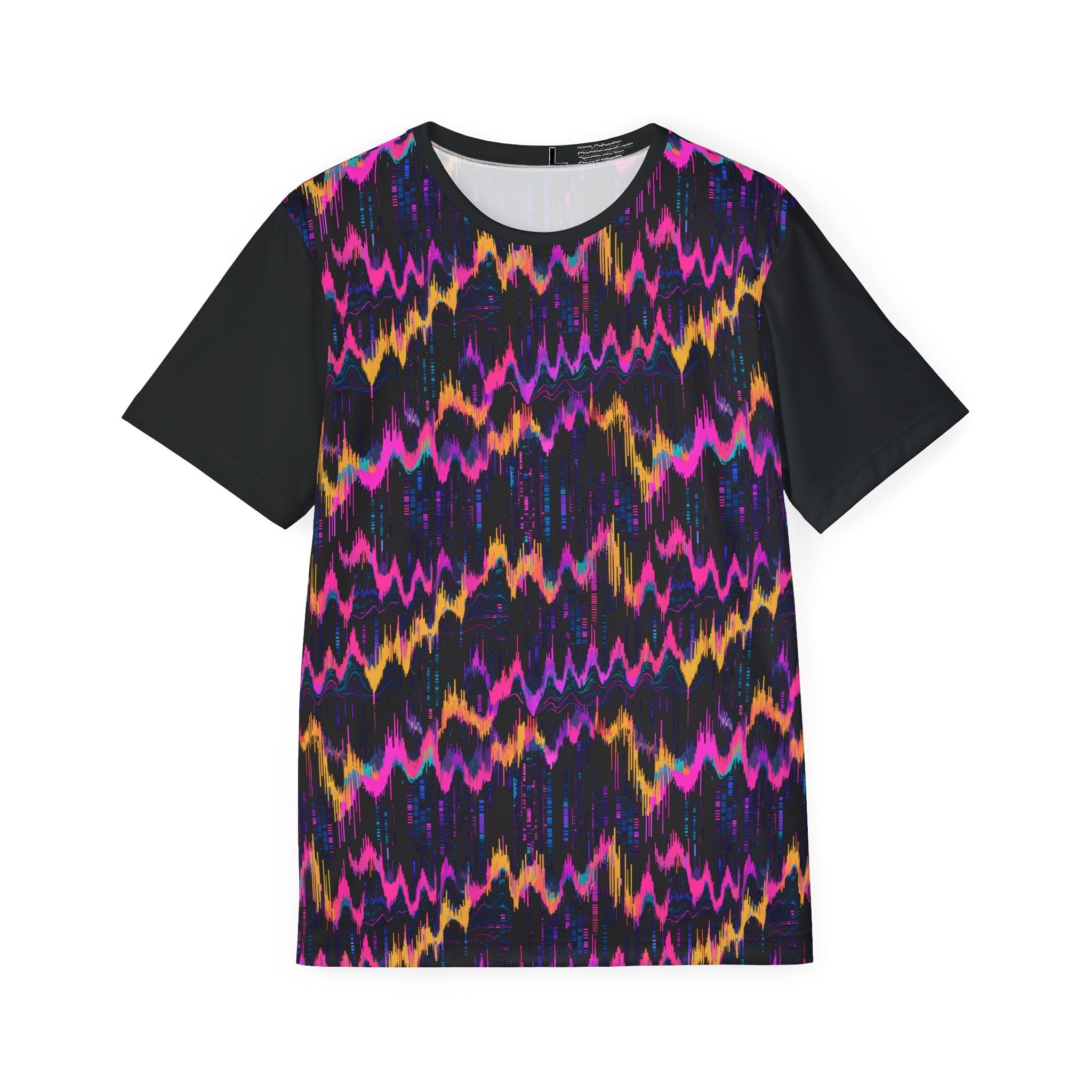 Hot neon WAV-inspired paint splotches and digital blocks dance across this jersey.
